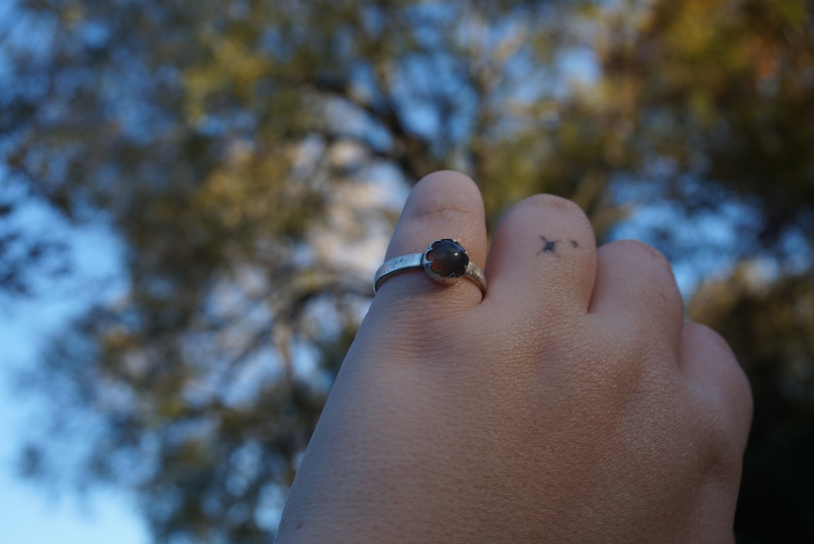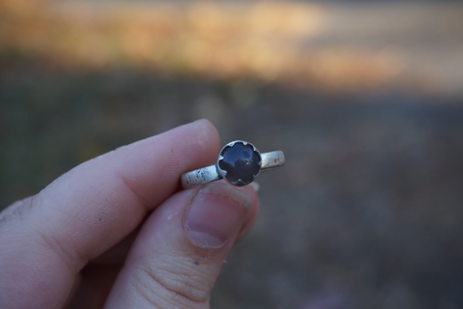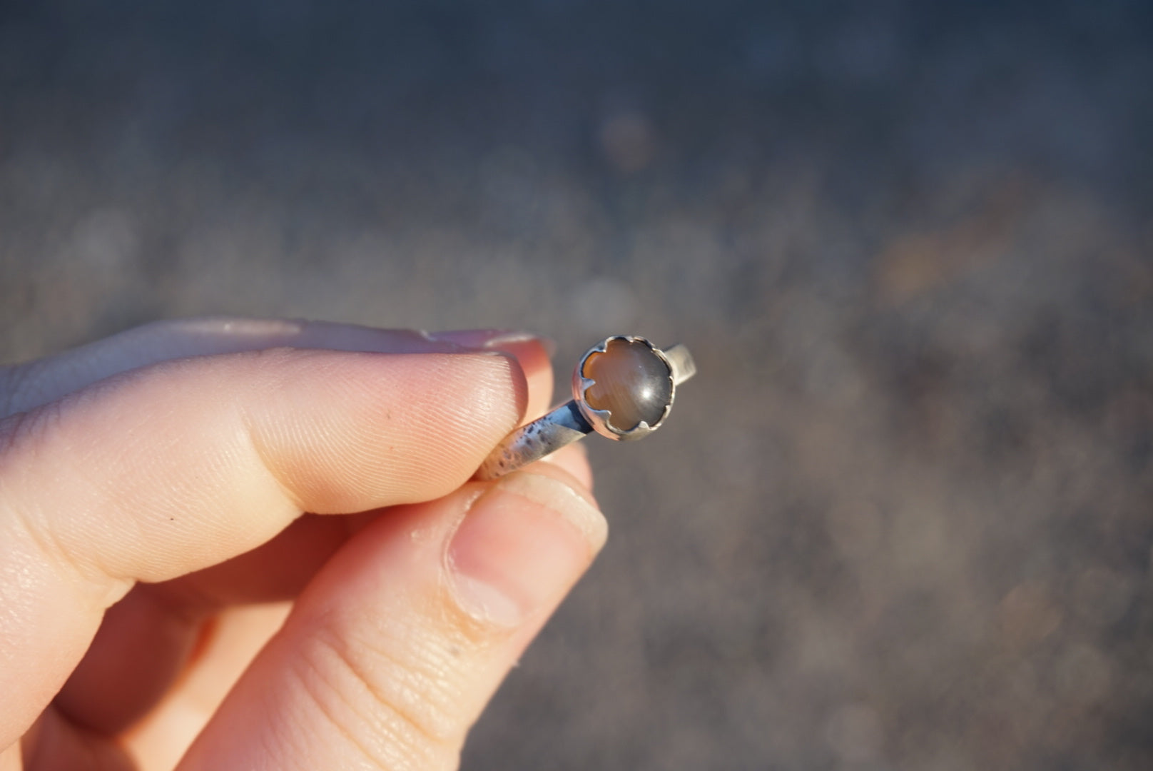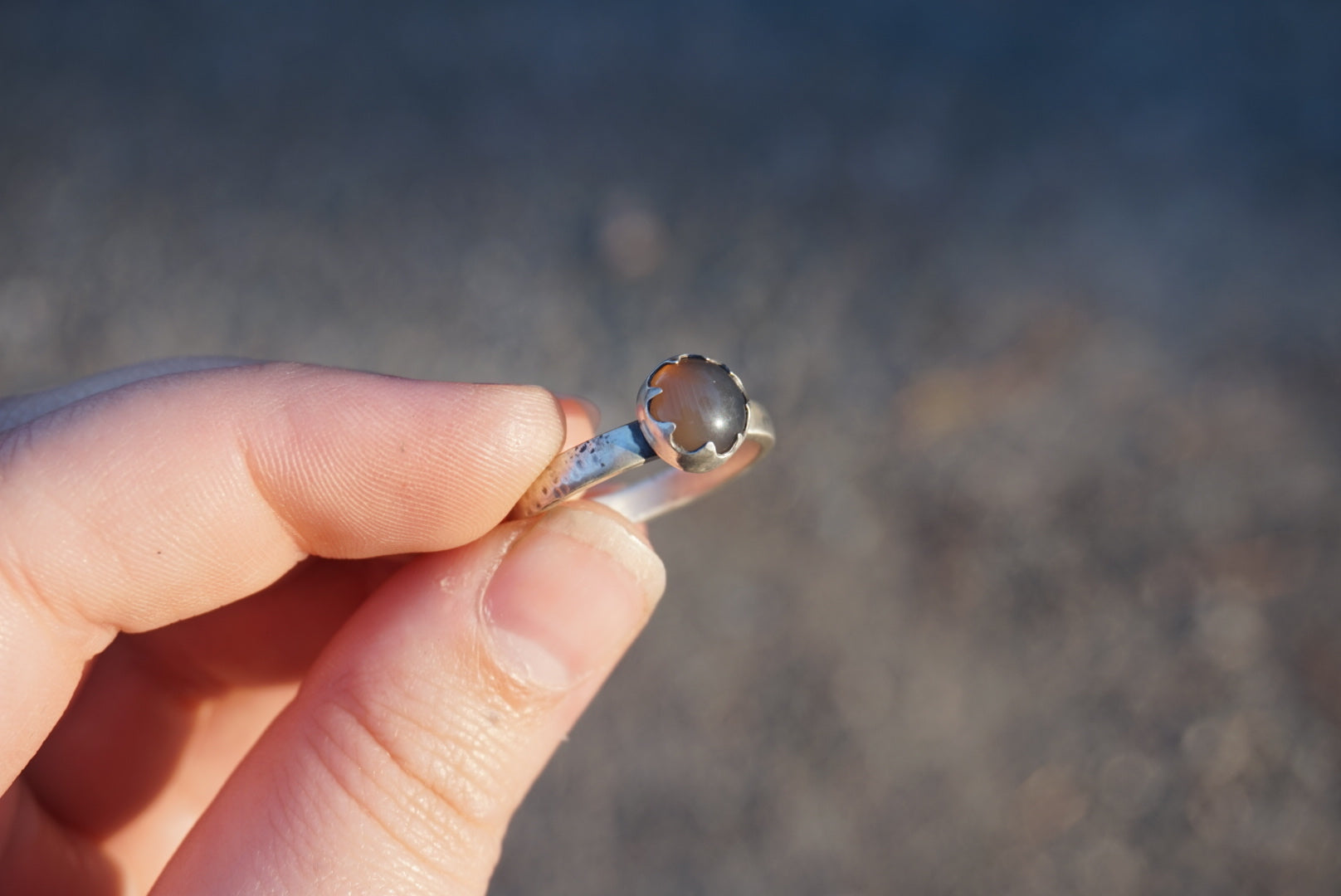 This ring features a grey moonstone, textured band, and hand carved reverse scallop bezel.