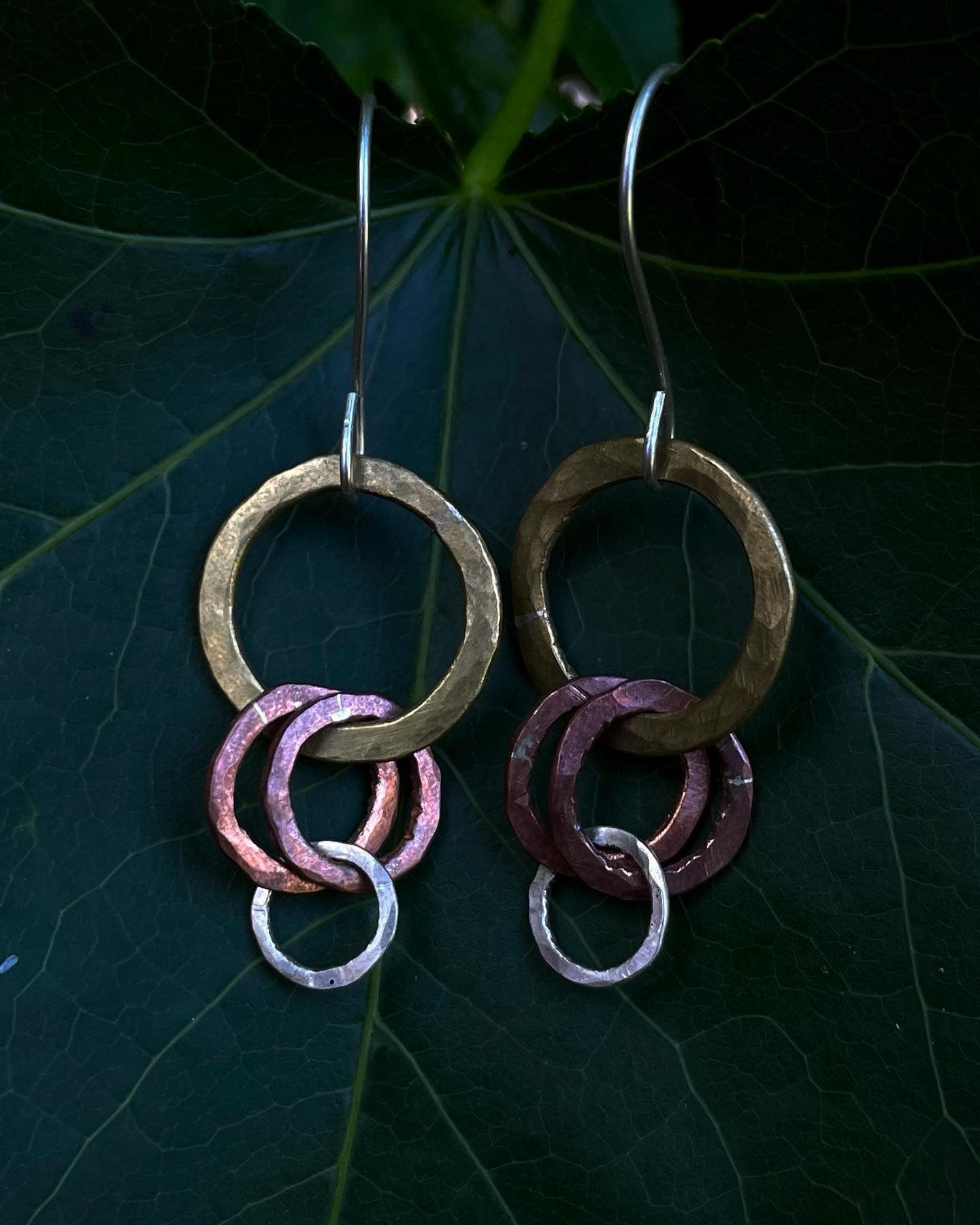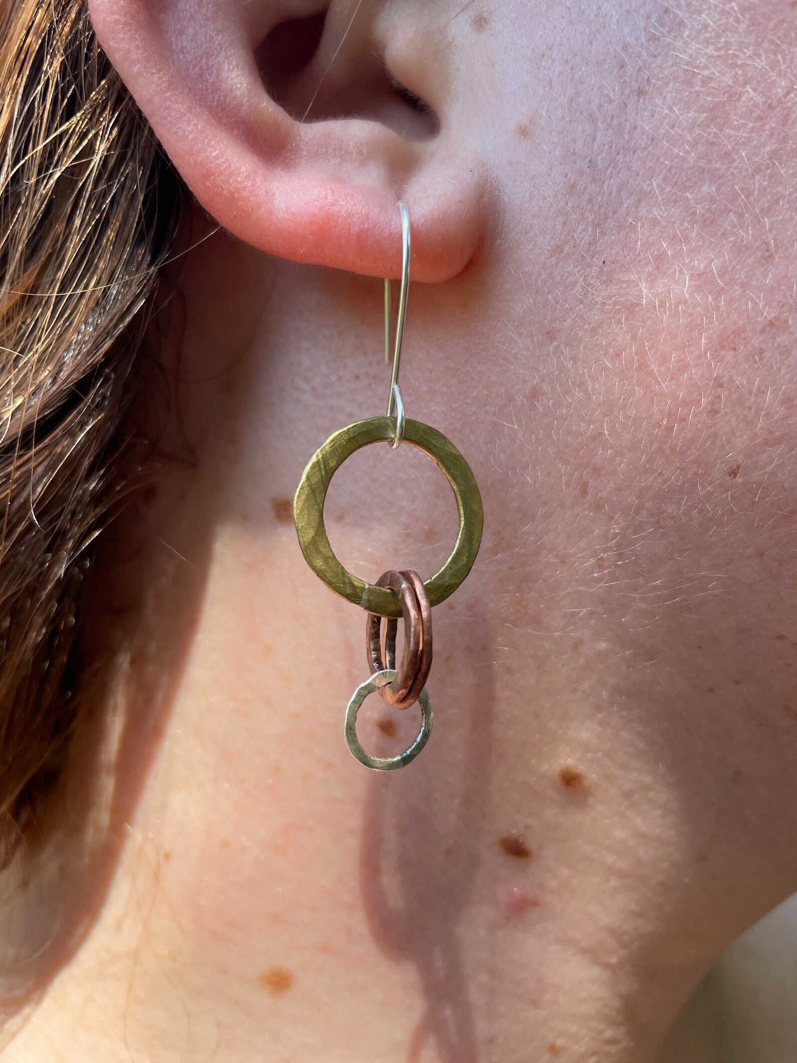 These earrings can feature brass, bronze, copper, and/or sterling silver. The ear wires will always be sterling silver but if you have any specific metal requests, let me know! Otherwise, they will be made intuitively with a mix of those metals.