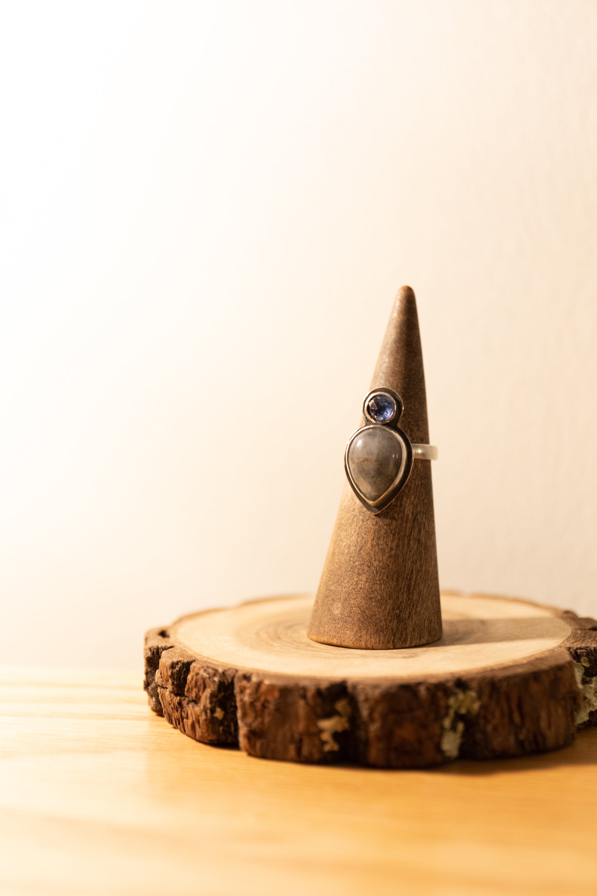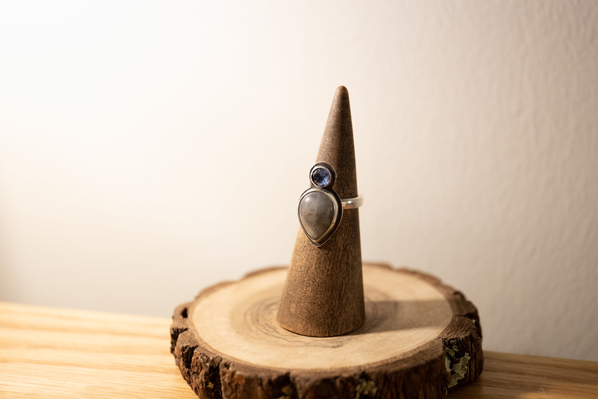 This ring features a teal moss kyanite and grey quartz stone. It is completely made of sterling silver.